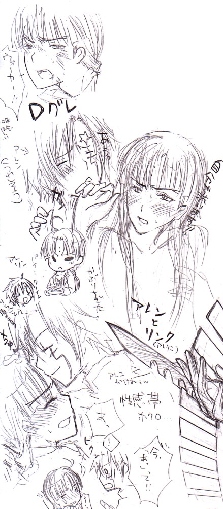 Gリンクがちょっと入ったけど気にしない。 上から ボロボロになりながらウォーカーって呼んで欲しい。勢い余ってアレンでもいい(ないわ) 右上が不自然にあいた(そこにあったやつを消したからです) お風呂に無理矢理着いてきたアレン。「髪洗ってあげますよ!^^」「自分で洗います!」 お風呂で色々っていいよね。声が響く…!ってね← アレンのためにパイを焼くリンク。「リンクごと頂きます」byアレン どっかにありそうなホクロ性感帯ネタ。アレンのでこの模様?忘れました。よく有る有る。 描くたび思うけど眉毛難しい。どう分かれてんの?! あと目。でかくなっちゃう… やばっ時間! 行ってきます。