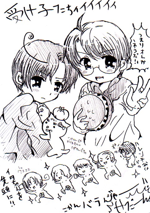 最初の三人はまあ許そう。けど独は…ルートはまずいって…!ひどいな。手に持ってるのはあれです。ヴルストです。これから嫁に突っ込みに行くらしいです。嫁はメリカとロマどっちだ的なことを聞いたら、墺さんだと言ってました。